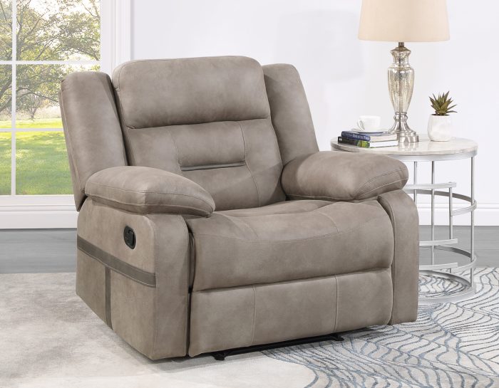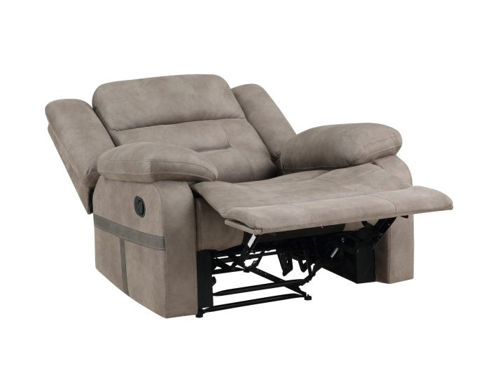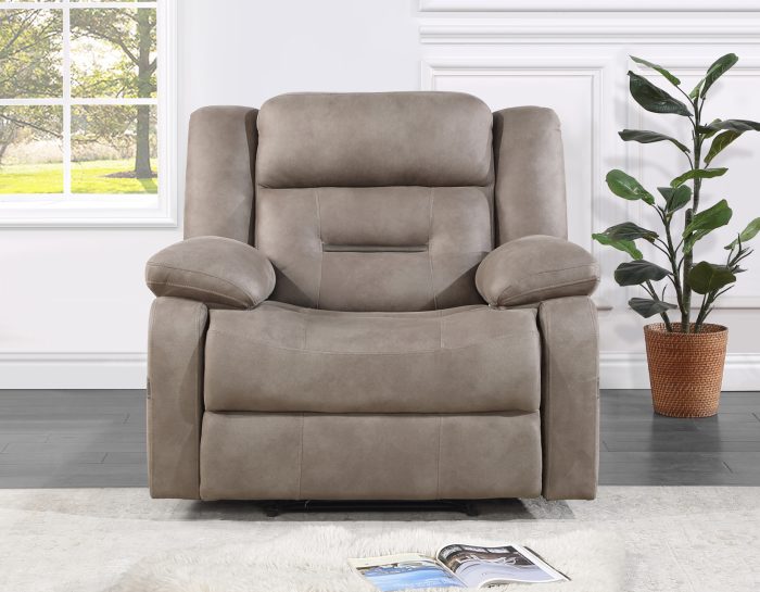 Our Abilene is the epitome of style and relaxation. A stylish tan microsuede cover and dark olive side panel accents make this manual recliner the perfect addition to any living or entertainment area.