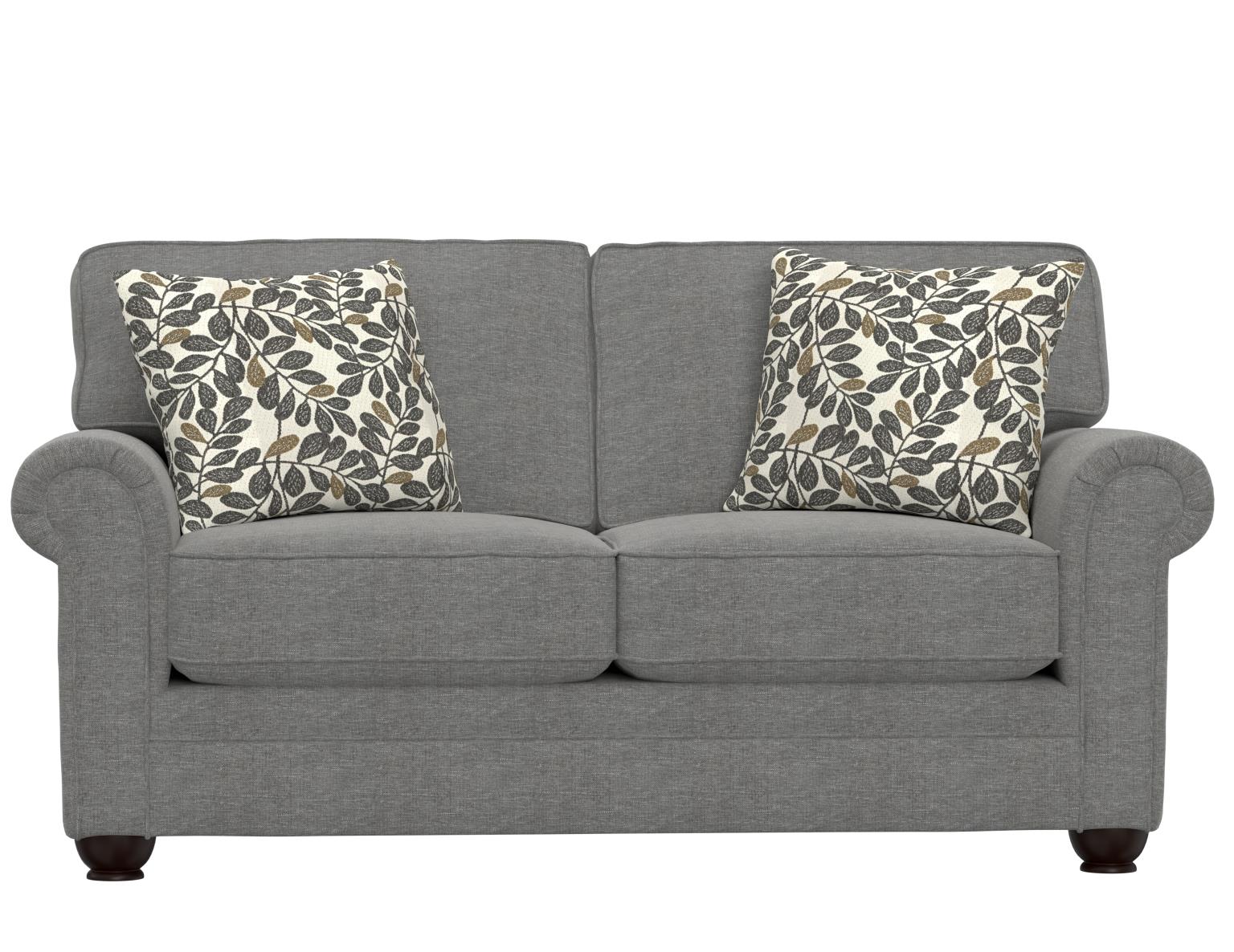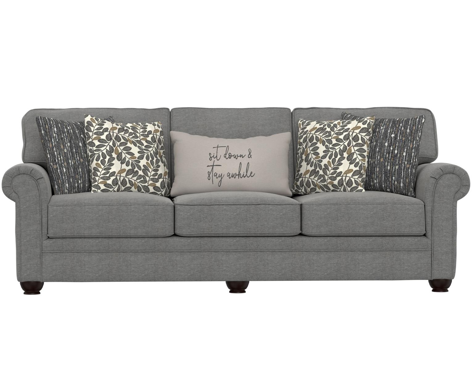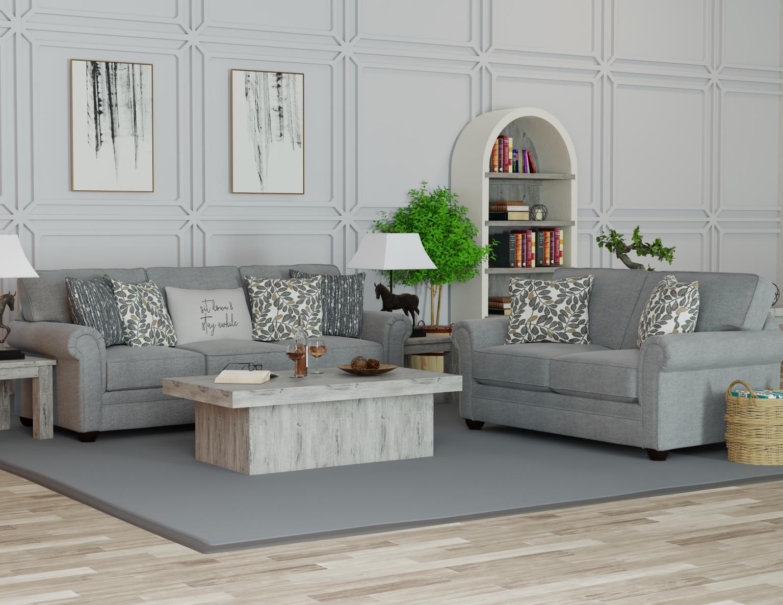 This furniture set is a beautiful gray color with three different accent pillows. It has classic stile cushions for great comfort!