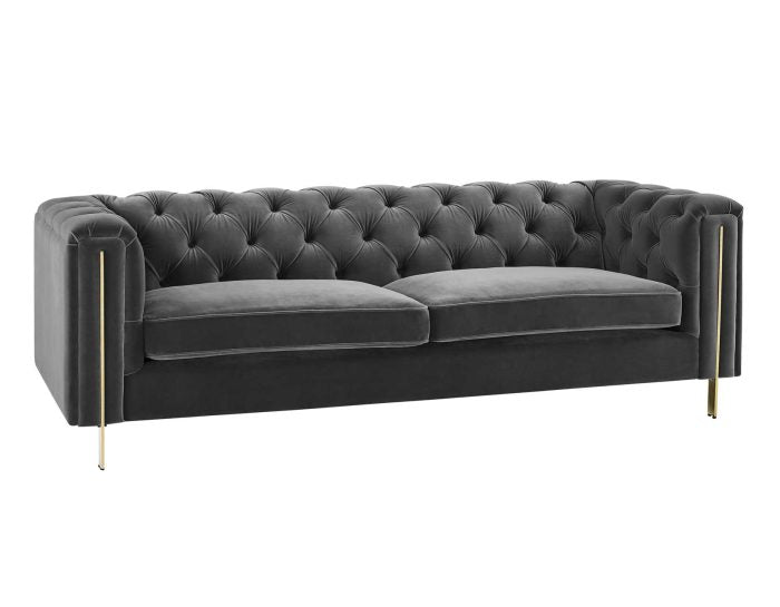 Fabulously elegant and yet wonderfully comfortable, Charlene blends classic and contemporary styles in a modern silhouette you won’t be able to take your eyes off. Curl up with a book on a rainy Sunday afternoon or entertain friends with this frame people will fight over. Butter-soft velvet is draped over a classic Chesterfield frame and then button tufted in an Old English look. A modern gloss brass frame adds a level of pop to the presentation that freshens up a classic upholstered silhouette. Choose from a bold blue or neutral gray velvet in Sofa or Loveseat for an elegant yet fun center to any living area.