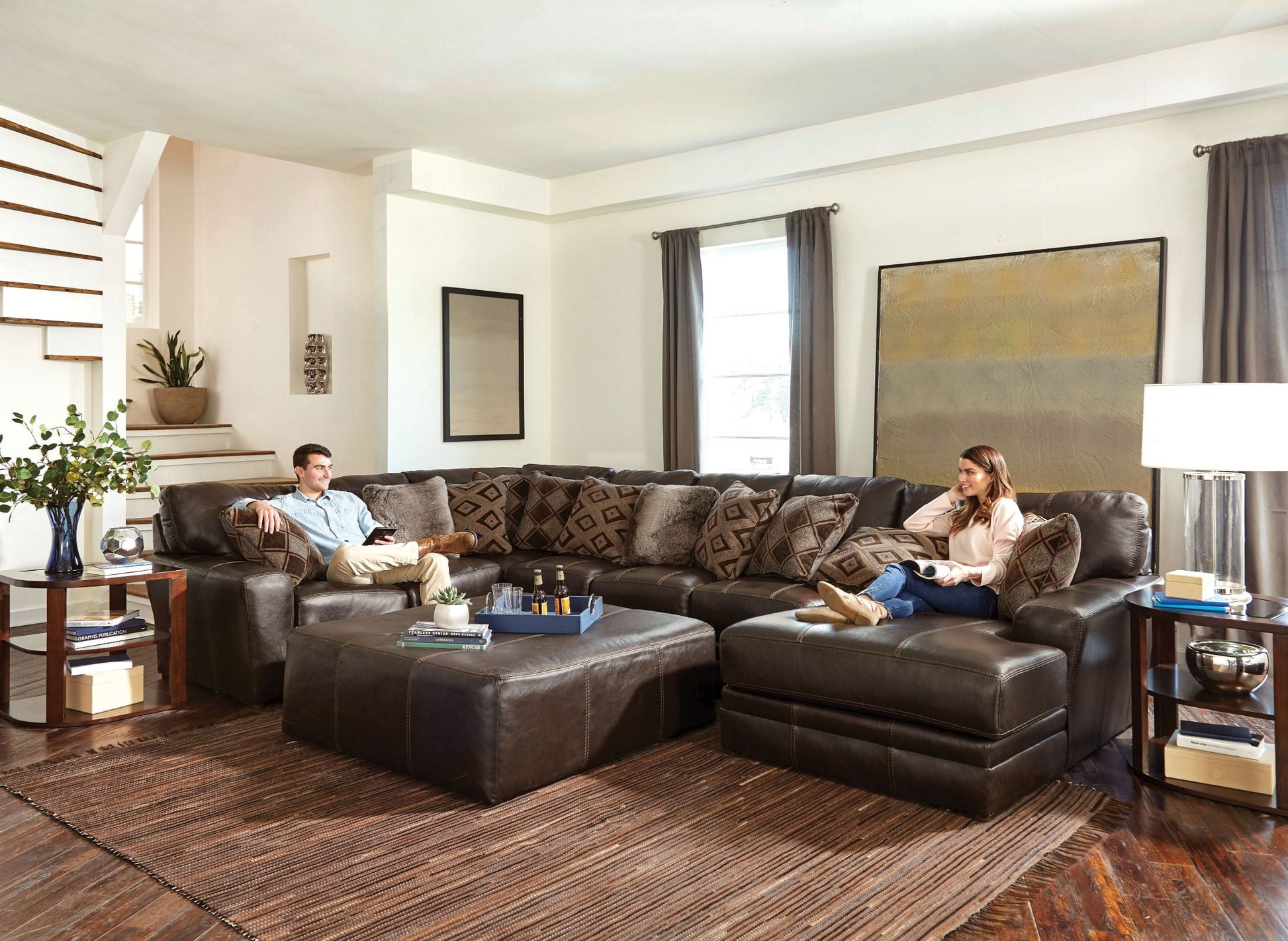 The Denali-Brown Italian Leather Sectional by Jackson Furniture epitomizes luxury and comfort. Upholstered in rich, top-grain Italian leather, this sectional boasts a deep, inviting seat design complemented by decorative luggage stitching. Its Comfort Coil seating, enhanced with Comfor-Gel memory foam, ensures a supportive and restful experience. The sectional includes a selection of stylish pillows, featuring faux fur and geometric patterns, adding a touch of elegance to its contemporary design. With its modular configuration, the Denali-Brown sectional offers versatility to suit various living spaces. Proudly made in the USA, it combines craftsmanship with timeless style.