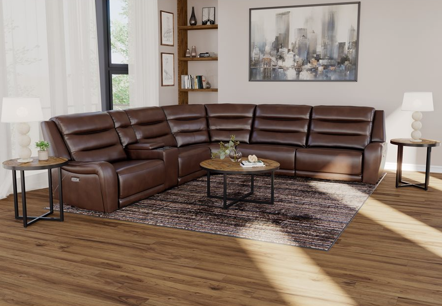 6PC - DUAL POWER SECTIONAL W/3 RECLINERS - BROWN LEATHER