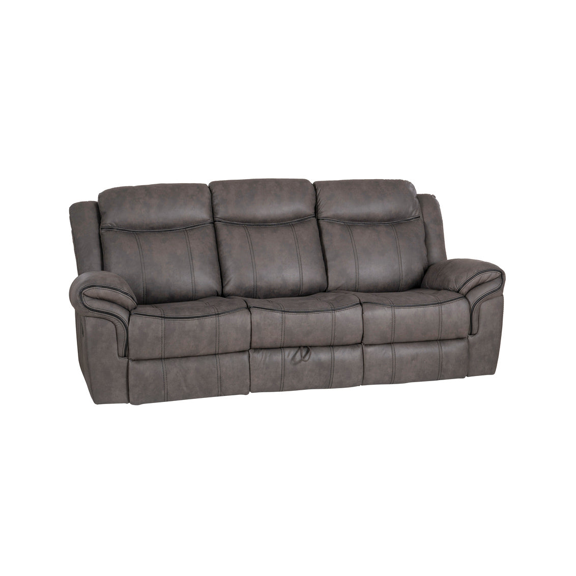 Relax in style and comfort with the Galloway, the perfect addition to any living room or entertainment space. Designed for both function and luxury, this sofa features a soft stone grey faux leather upholstery that adds a sophisticated touch to your décor. The black stitching and welt seams highlight the sleek contours of each piece, creating a modern and refined look. Two manual reclining seats offer personalized comfort, while the lift-top storage console provides convenient storage and features two 3-prong outlets and two USB ports for charging devices.