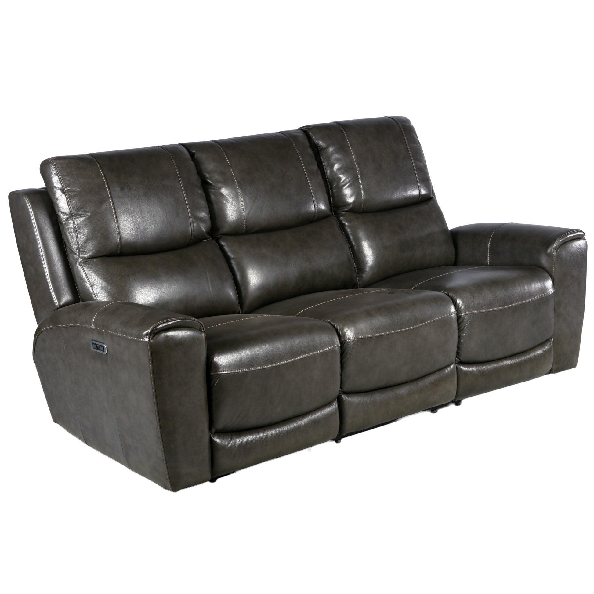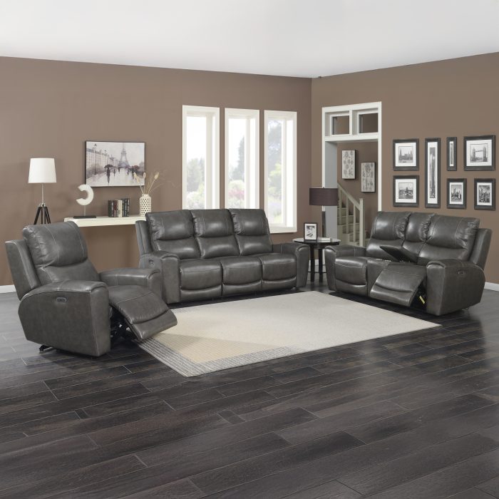Contemporary styled collection constructed in leather with power leg rest and power articulating headrest. Laurel features both styling and convenience with USB charging port on the control panel along with a home button to return the piece to its original position. The loveseat feature’s dual reclining seats and a console with cup holders and hidden storage.