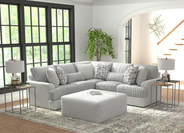 Revamp your living room with the Jackson Titan Sectional. Crafted to combine modern style with ultimate comfort and upholstered in luxuriously soft faux fur fabric of a sophisticated gray color, this sectional features a contemporary "Shark Fin" arm design and sturdy steel tech framing. Its deep seating includes a cuddler cushion for enhanced relaxation, while Comfort Coil Seating with Comfor-Gel ensures optimal support. The sectional is adorned with coordinating toss pillows and comes with back cushions in a gray wide welt corduroy, offering both aesthetic appeal and comfort. Ideal for any living space seeking a blend of chic design and inviting comfort, the Jackson Titan Sectional is a standout choice.
